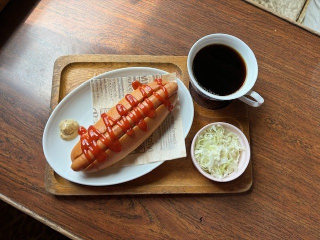 ハムサンド、たまご、サラダ、下記の飲み物600円 - ホットドッグモーニング